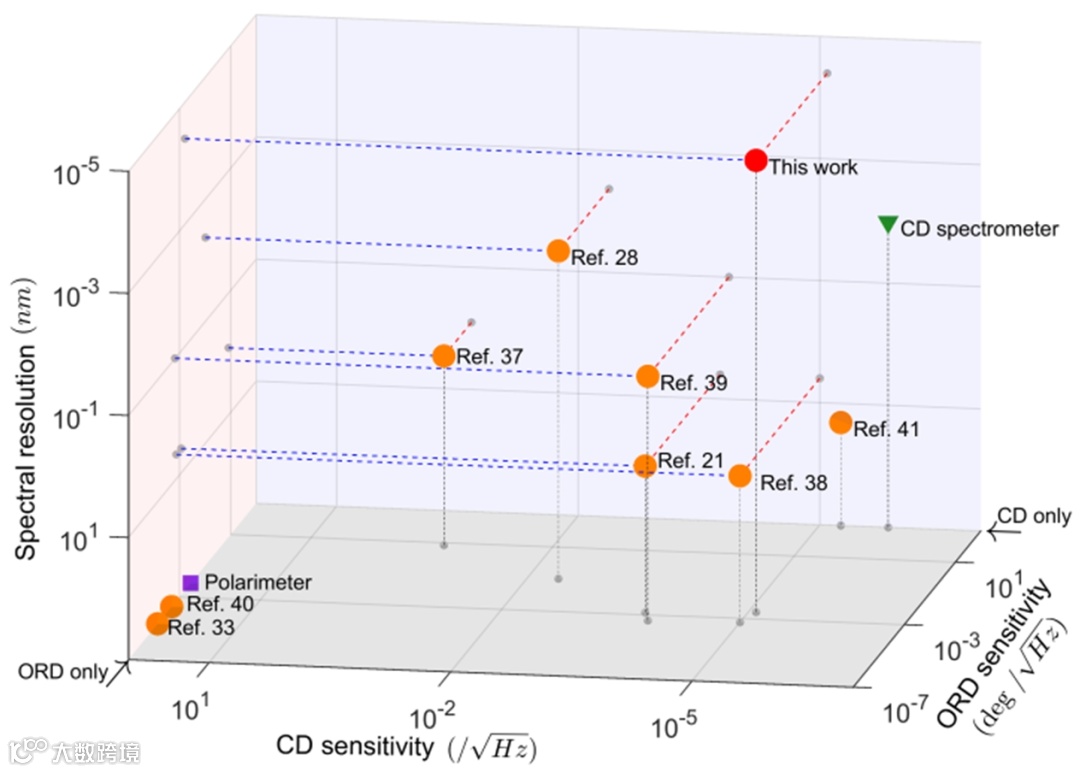 图1:不同的设计方案下,ORD和CD测量灵敏度与谱分辨率的结果。红色圆圈代表本工作的实验结果。