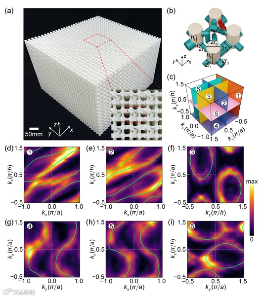 图2 布里渊半旋转空间和克莱因空间的实验观测。(a)样品的照片。(b)三维声子晶体的单胞示意图。(c)6个彩色平面分别是从三维布里渊半旋转空间(①-③)或克莱因空间(④-⑥)切割而来的二维布里渊区。(d)-(i)分别对应于图(c)中6个二维布里渊区切面的实验(颜色图)和模拟(绿线)的体能带结构的等频色散图。