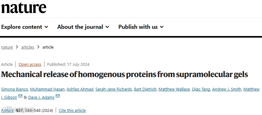 2024年7月17日,相关研究成果以题为“Mechanical release of homogenous proteins from supramolecular gels”发表在 Nature上。