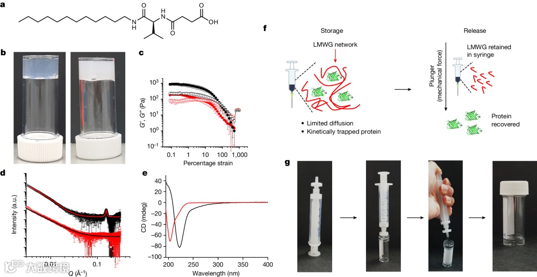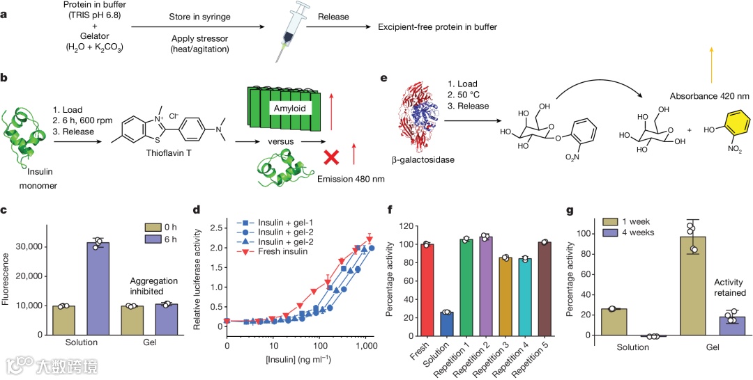 为了解决这个问题,英国格拉斯哥大学Dave J. Adams教授、英国华威大学Matthew I. Gibson教授设计了一种坚硬的水凝胶,即使在50摄氏度的温度下也能稳定蛋白质的热变性,而且与现有技术不同的是,它可以通过机械地从注射器中释放出纯净的、无赋形剂的蛋白质。在不影响释放机制的情况下,大分子可以以10% 的重量负载。这种独特的稳定和无赋形剂释放协同提供了一个实践。