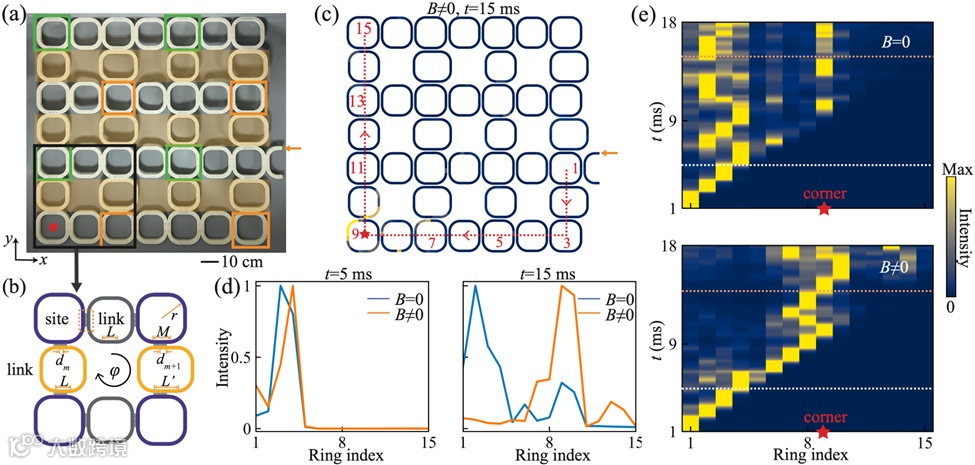 进一步,研究团队提出利用合成磁场诱发高阶NHSE。其二维实验样品如图2(a)所示。通过调节耦合环的大小及放置位置,可获得合成磁场及负耦合。当B=0时,系统边界上没有任何单向传播或角落局域化[图2(e)]。但当引入合成磁场时,测量得到的声强分布演化具有很大的不同,如图2(e)所示。当t>10 ms时,声波停止传播并局限在角落,表明出现了高阶趋肤效应。