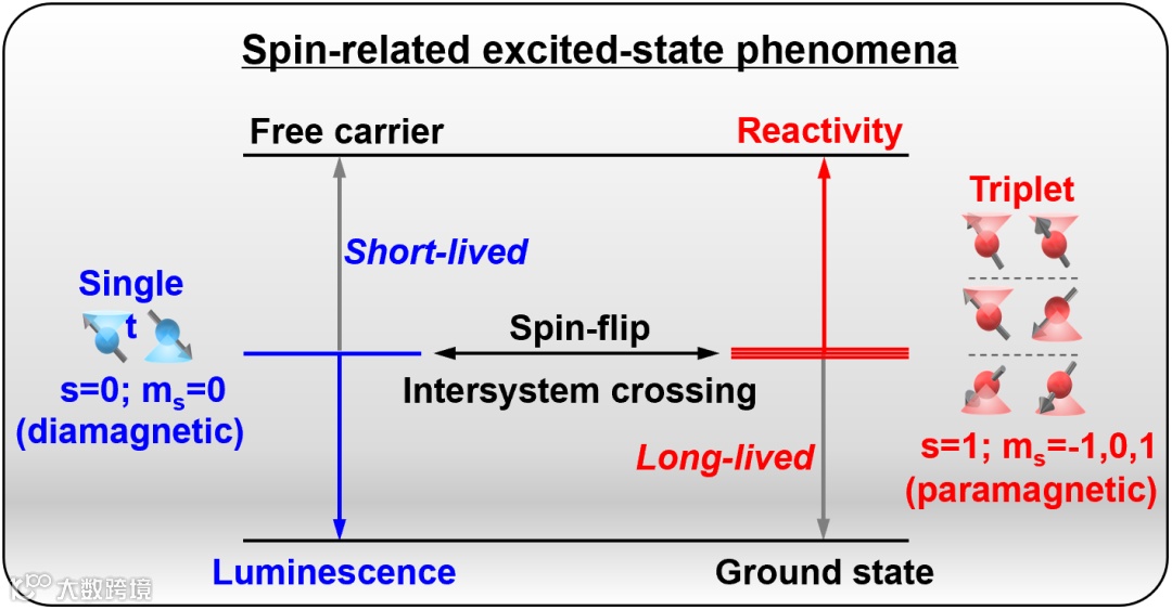 材料可以通过吸收光发生电子跃迁,产生的激发态具有自旋多重性(spin multiplicity),即产生单线态(singlet,s=0, ms=0)和三线态(triplet,s=1, ms=−1,0,1)。如图1所示,单线态和三线态不仅在发光性质(luminescence)上有显著差异,在本身磁性和反应活性(reactivity)上也有所不同。单线态通常寿命较短,且更容易通过辐射跃迁回到基态,产生荧光。三线态具有净自旋(顺磁性),由于跃迁自旋禁阻导致其寿命较长,需要借助自旋-轨道相互作用发射磷光。同时,单线态和三线态具有不同的光化学反应活性,比如三线态光敏剂常用于光动力疗法中以产生活性氧物种。