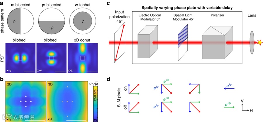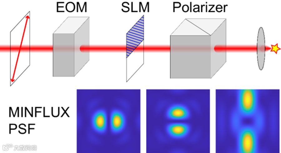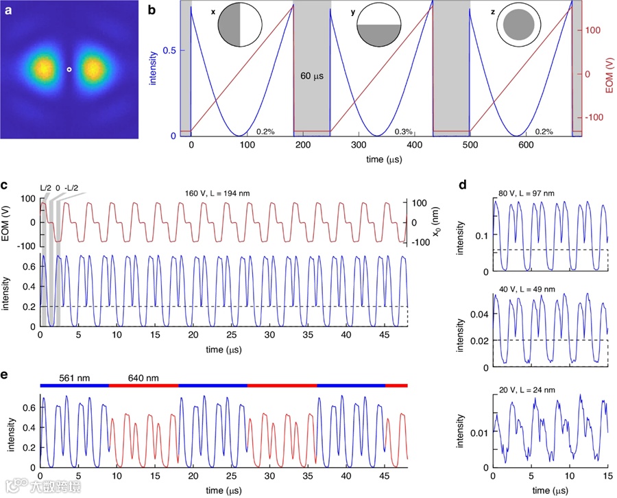 在光轴上或在物镜的焦点上利用光束相消干涉产生最小的对称图案,这需要存在π的相位差。相位模式的产生可以用空间光调制器,其可以通过改变相位来扫描强度最小的位置。然而,对于MINFLUX所需的快速扫描,使用空间光调制器产生连续相位的延迟太慢,因此仍然需要电光偏转器实现快速扫描。如图1(c)所示,本研究通过结合电光调制器、空间光调制器和偏振器来产生具有可变相位延迟的二元相位图。入射激发光以45°偏振角进入偏振轴垂直方向为0°的电光调制器。因此,电光调制器可以在光束的垂直偏振分量和水平偏振分量之间产生相位延迟。