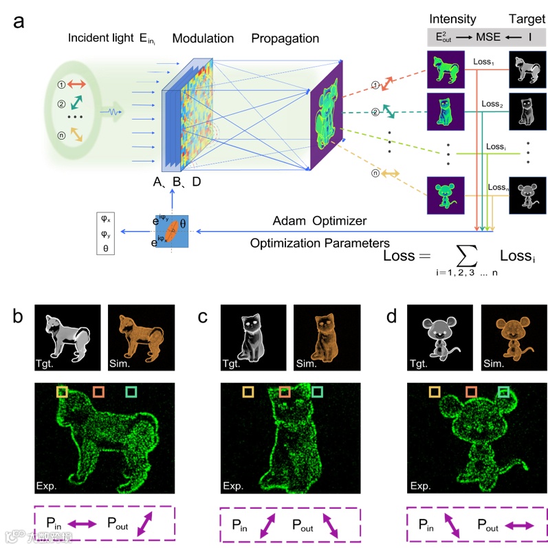 为了获得超表面精细和最优全局效应,研究团队开发了如图2a所示的矢量衍射神经网络。这种网络可以优化超表面单元的振幅、相位和旋转角度,使多个偏振通道同时实现最优效果。图2b-d展示了这种方法在三循环非正交偏振复用全息图上的设计目标、仿真与实验结果,各通道间的串扰被控制在了极低的水平。