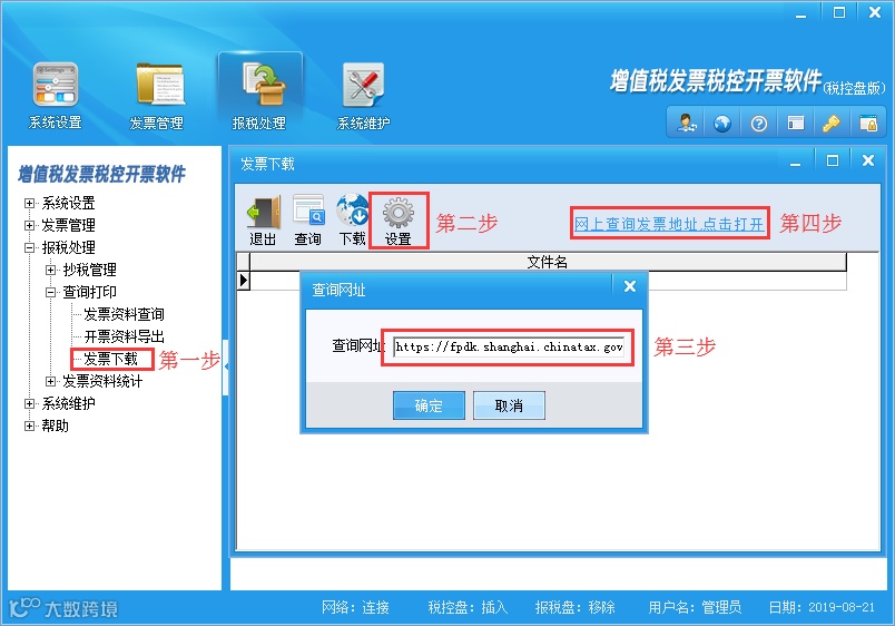 3、通过开票软件登录,登录开票软件后,打开“报税处理”—“查询打印”—“发票下载模块,点击“设置”删除原地址,将新域名