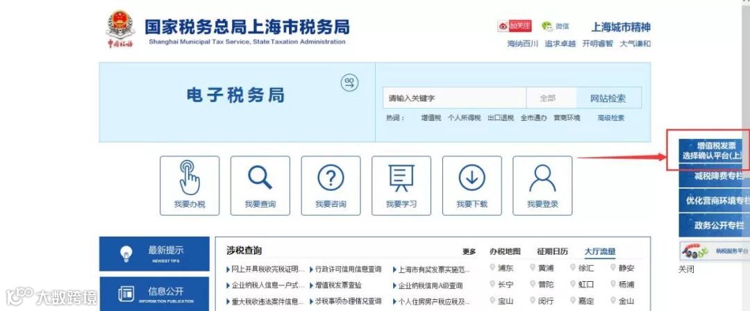 1、通过上海市税务局网站(shanghai.chinatax.gov.cn),首页“增值税发票选择确认平台(上海)”图标打开平台。