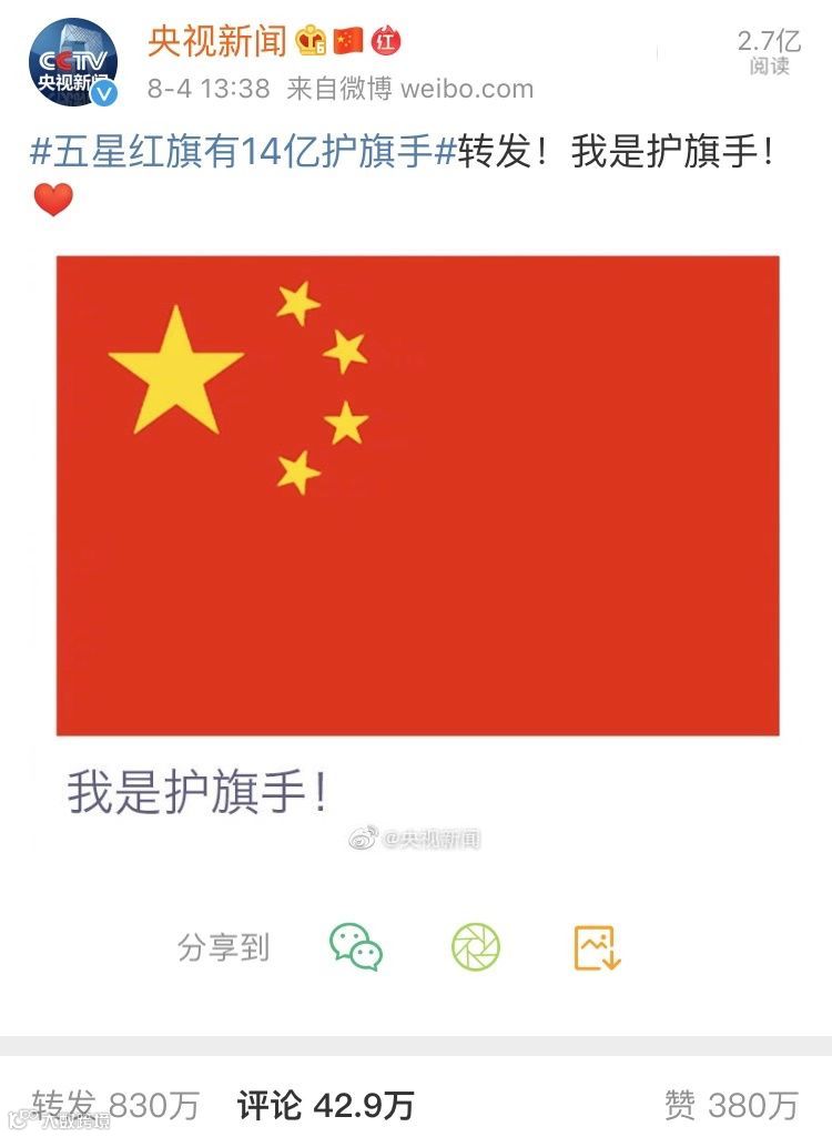 8月4日,央视新闻发起话题#五星红旗有14亿护旗手#(详情点此)引燃全网。网友纷纷表达了身为中国人的骄傲,同时强烈谴责暴徒侮辱国旗的行径。爱国,化为了一场百万人参与的立场坚定、态度鲜明的宣言。心之所系,情之所归,爱国,就是中华儿女的闪光日常。