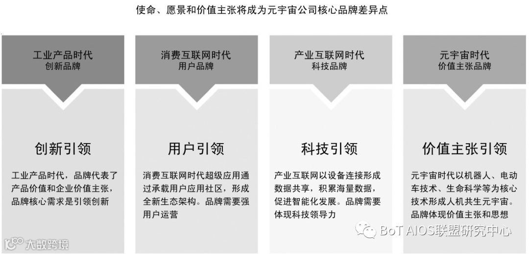 在传统的工业产品时代,品牌主要强调创新,消费互联网时代强调用户引领,产业互联网时代更强调科技引领,而在元宇宙时代,由于元宇宙中机器人、AI智能的参与,以及数据的聚集和再膨胀等特点,价值主张成为元宇宙最核心的品牌特质。