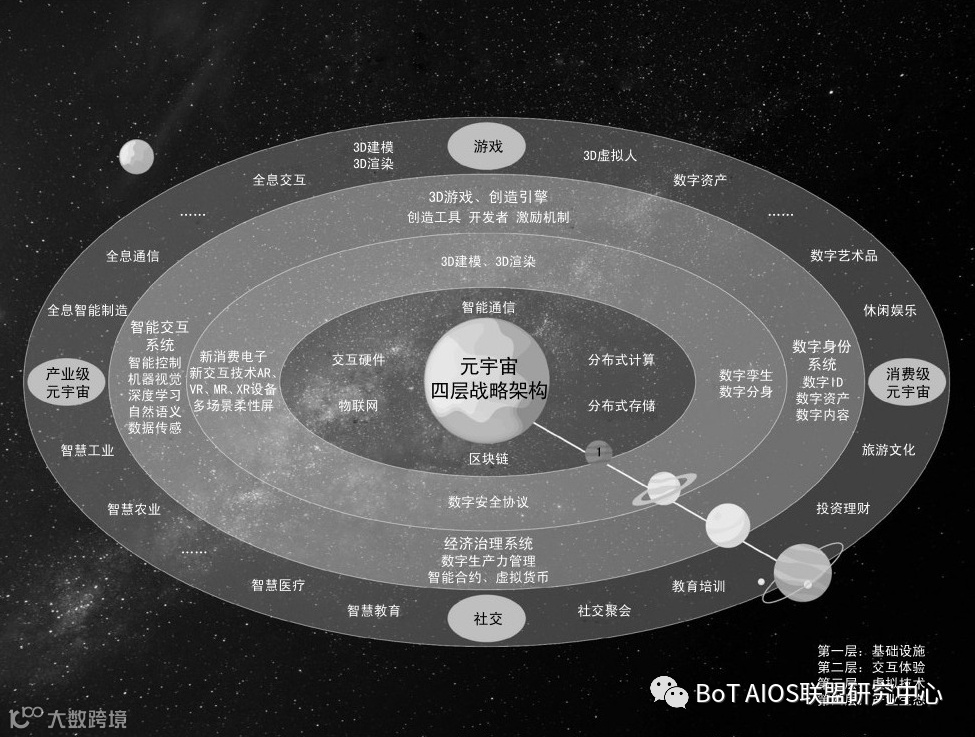 元宇宙商业模式四层战略架构是一个共性的战略逻辑,它从基础设施、交互体验、虚拟应用和产业生态4个维度概括了元宇宙战略的构建逻辑。