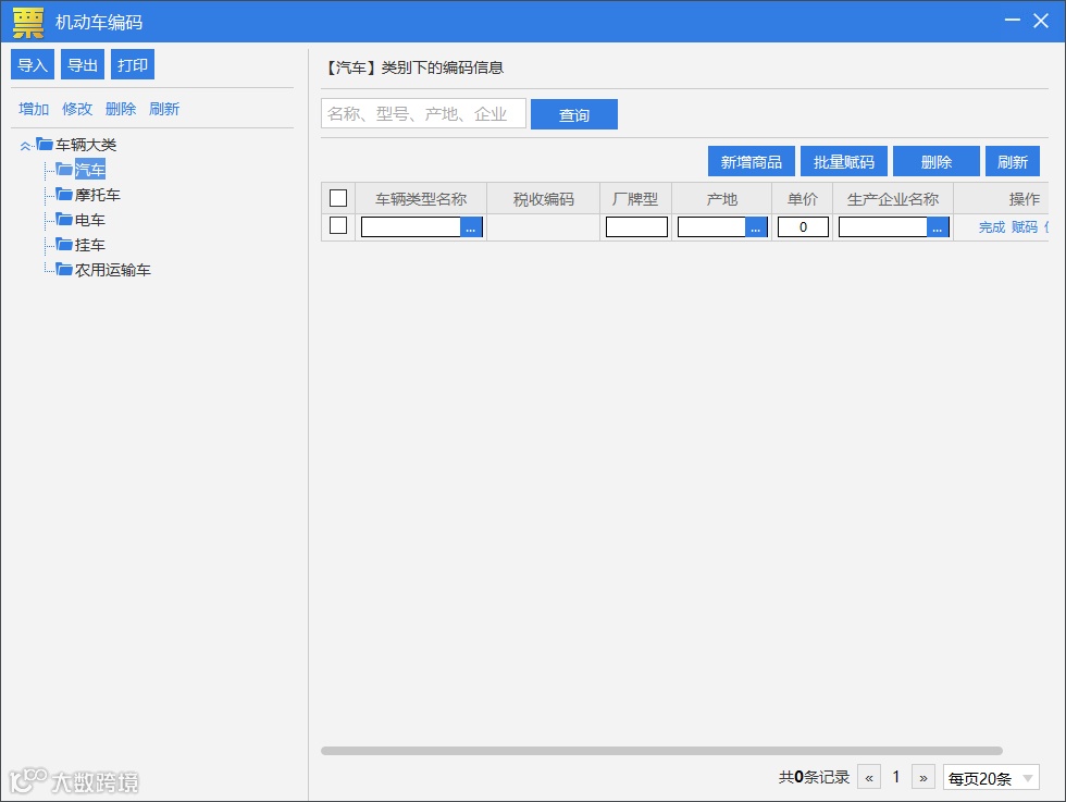 解答:系统设置/基础编码设置/机动车产品设置,选择左侧的“车辆大类”下面的类别之后点击右边的“新增商品”按钮,填写车辆类型名称,产地(开票软件V2.0.43_ZS_20210630版本起,不再是必填项),生产企业名称,选填厂牌型号和单价,点击“完成”按钮后,再点击“赋码”按钮,打开商品和服务税收分类编码界面可以通过搜索关键字等方式,选择对应的分类,再根据用户的实际情况,填写是否使用优惠政策,填写税率等,点击确定即可。