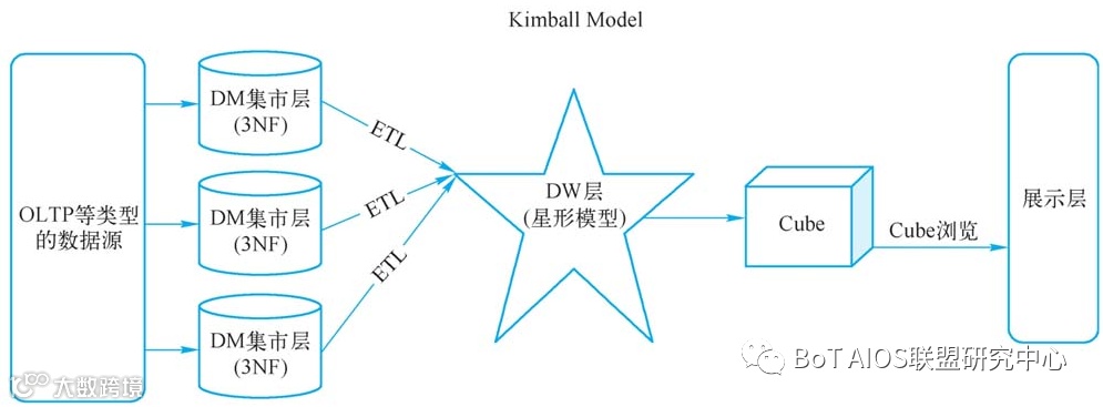 Kimball认为数据仓库的数据肯定是来源于数据集市的,集市的数据经过ETL过程之后再进入DW层,而DW层中的数据不再细分,直接在DW中计算Cube(业务逻辑处理),再把Cube结果输出。