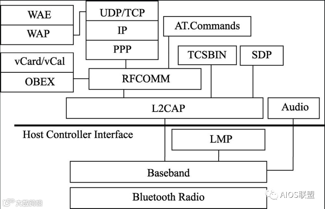 除上述协议层外,规范还定义了主机控制器接口(Host Controller InterfaceHCI),它为基带控制器、连接管理器、硬件状态和控制寄存器提供命令接口。在图1.11中,HCI位于L2CAP的下层,但HCI也可位于L2CAP上层。