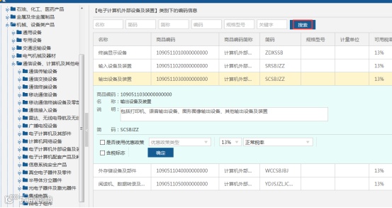 第四步:在弹出的商品和税收分类编码表中选择准确的编码,或者通过查询搜索来选择要赋的商品编码。勾选是否使用优惠政策,确认税率,是否含税标志后,点击“确定”按钮完成赋码。如图所示: