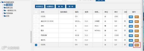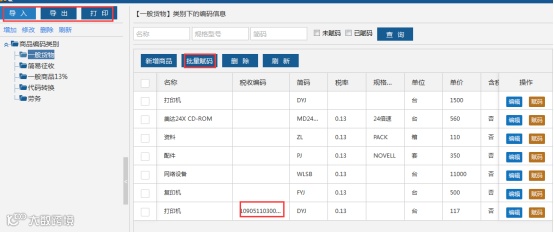 第五步:赋码成功后,返回商品编码页面,显示对应税收分类编码。如下图所示。如需批量赋码,可勾选多个需要赋码的同类商品,点击“批量赋码”按钮,赋码完成即可。商品编码模块也提供导入,导出和打印功能。
