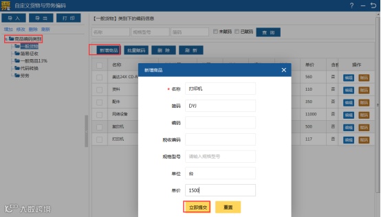 第二步:在新页面中点击左侧“商品编码类别”,右侧点击“新增”商品按钮。在新增商品输入框中输入名称,自动生成简码,继续输入规格型号、单位、单价,点击“立即提交”。如图所示: