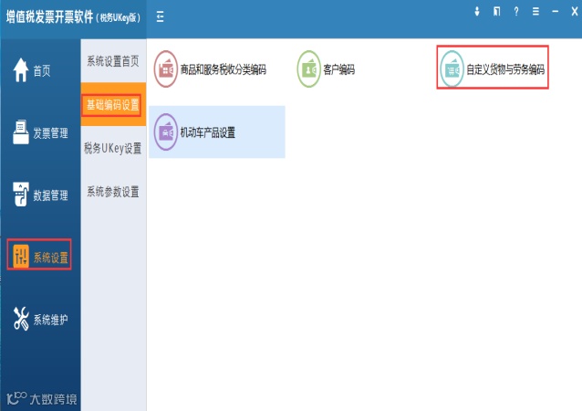 第一步:点击【系统设置】-【基础编码设置】-【自定义货物与劳务编码】模板。