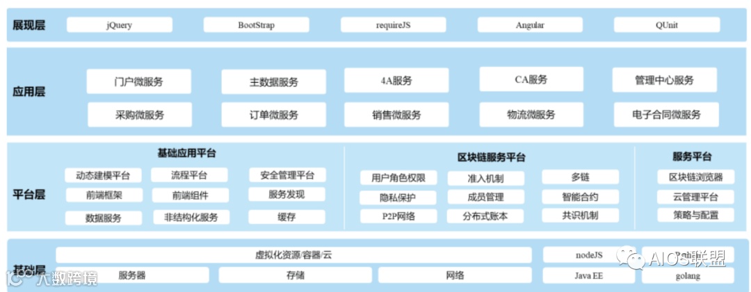 基于区块链的供应链管理系统的技术架构分为基础层、平台层、应用层和展现层