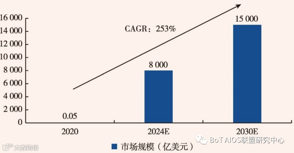 “彭博行业研究”预计元宇宙市场规模将在2024年达到8000亿美元,普华永道预计元宇宙相关经济将迎来大幅增长,市场规模有望从2020年的500万美元增至2030年的15000亿美元,2020—2030年的CAGR(Compound Annual Grwth Rate,年复合增长率)达到253%。