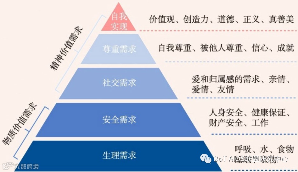 人类需求分为物质价值需求和精神价值需求,元宇宙的发展匹配马斯洛人类需求理论中的各种需求。