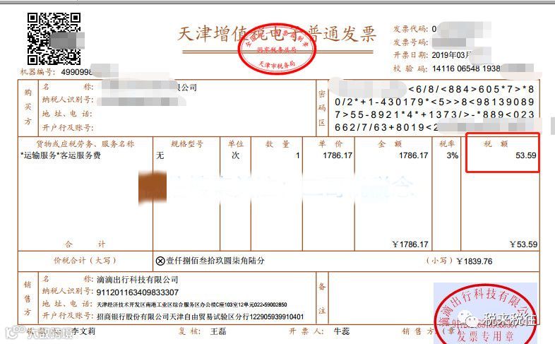 这张滴滴的出租车电子发票,我们可以直接按照票面税额53.59进行抵扣。为什么这里是3%呢?因为销售方采用了简易计税。