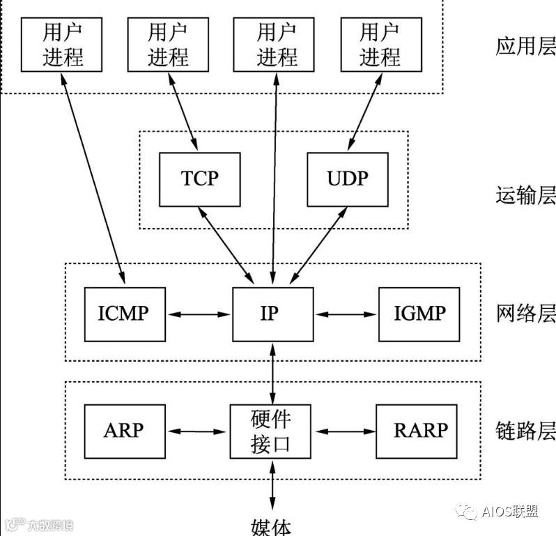 ● 链路层:也称数据链路层或网络接口层。包括操作系统中的设备驱动程序和计算机中对应的网络接口卡。它们一起处理与电缆(或其他任何传输媒介)的物理接口细节。