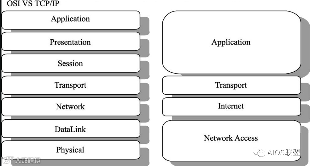 TCP/IP协议族跟OSI模型的对比: