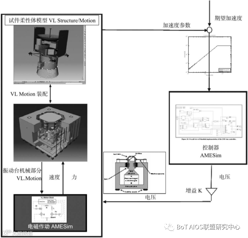 如使用西门子公司的AMESim模块可以使振动控制器和电磁/电液助动部分均基于AMESim的控制、电磁库以及液压库建立,通过AMESim与虚拟仿真的无缝集成接口,将振动控制和电磁/电液部分与振动台实现闭环