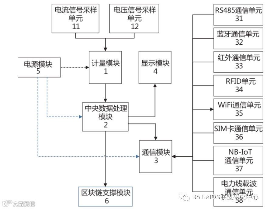 该电表包括计量模块、中央数据处理模块、通信模块、显示模块、电源模块和区块链支撑模块。