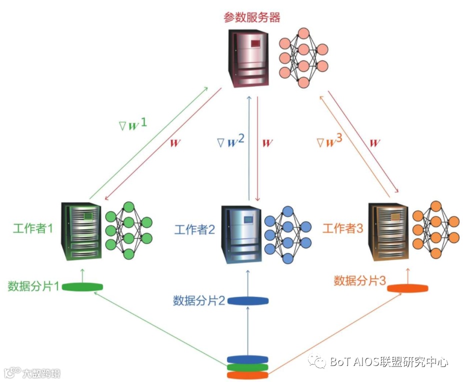 一个由三个工作者(即计算节点)和一个参数服务器组成的分布式机器学习系统,训练数据被分为不相交的数据分片(Shard)并被发送给各个工作者,工作者将在本地执行随机梯度下降(Stochastic Gradient Descent,SGD)。