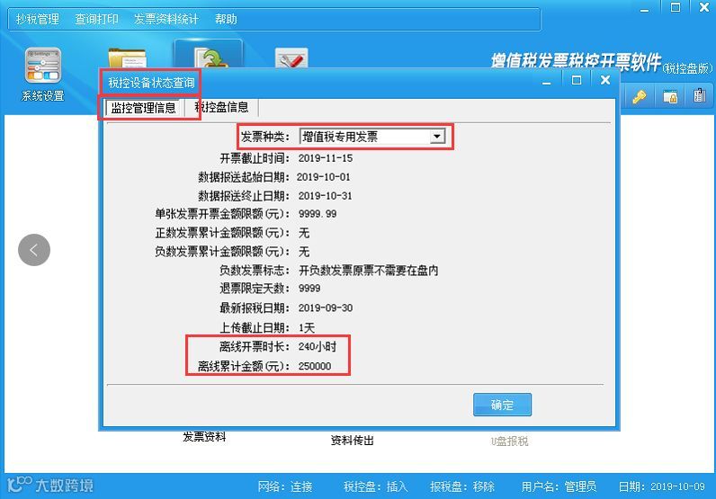 2、务必于2019年10月24日17时前联网开启(登录)税控开票系统,确认发票上传完毕、离线开票时长和离线累计金额下载完成。