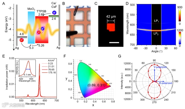 图2. TTPSB OPLED的明场、电致发光图像及红光CIE坐标。