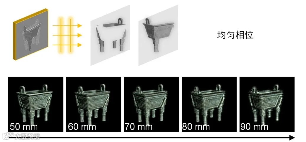· 均匀相位的物光波前带宽较小且不发生散射,能够实现高度逼真的无散斑重建。均匀相位从物理上描述了自然界中极度光滑表面给物光波前带来的相位分布,例如镜面物体表面,这样的物体表面即使在被相干光照射的情况下也极少产生散斑。如图11所示,重建波前在离焦位置重建出的是轮廓外扩的衍射图案而不是模糊效果,因此重建波前会失去作为散射前波的传播特性,并且无法在三维空间中带来物体的纵深感。