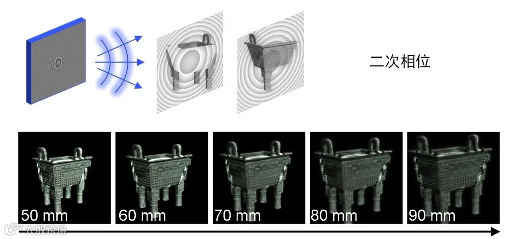 · 会聚的二次相位也常在正向模型中被用作物光波的初始相位。在二次相位的全息图重建中,随着传播距离的增加,重建强度图案的空间尺寸也随之放大。如图12所示,由于这种缩放特性的存在,二次相位使重建波前无法如实地反馈三维物体的真实大小关系,无法在三维空间中保持其整体尺寸特征。因此,二次相位的全息图大多被应用于二维的全息投影。