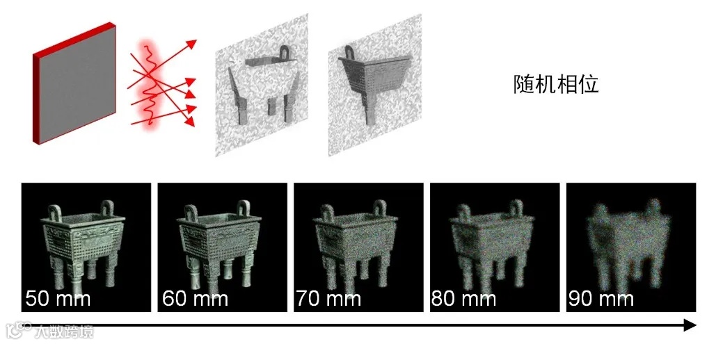 · 随机相位的使用默认了物光波前所记录的物体具有散射表面,由于现实世界中的大多数材料在波长的尺度上是粗糙的,粗糙散射表面的各个微观面为入射光贡献了随机分布的相位。如图10所示,随机相位物光波前能够重建出类似散射体的离焦效果。这种与真实世界类似聚焦与离焦效果是全息显示纵深感的重要来源。但由于计算全息通常使用相干光照明,随机相位也为重建带来了散斑噪声。
