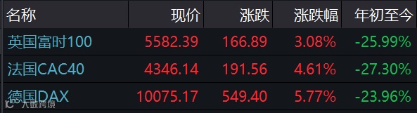 欧洲股市全面回暖。英国富时100指数涨3.08%,法国CAC40指数收涨4.61%,德国DAX指数涨5.77%。