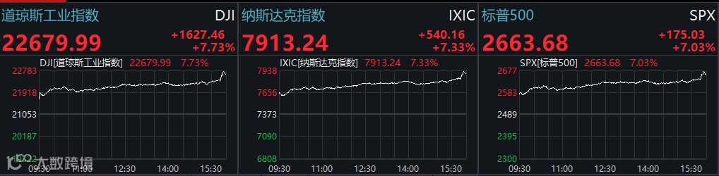 Wind数据显示,道指涨逾1600点,报22679.99点,涨7.73%;标普500指数报2663.68点,涨7.03%;纳斯达克指数报7913.24点,涨7.33%。