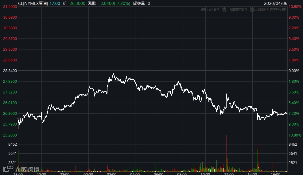 美、布两油未能延续此前涨势。截至收盘,NYMEX原油大跌7.2%,报26.3美元/桶;ICE布油跌2.46%,报33.27美元/桶。
