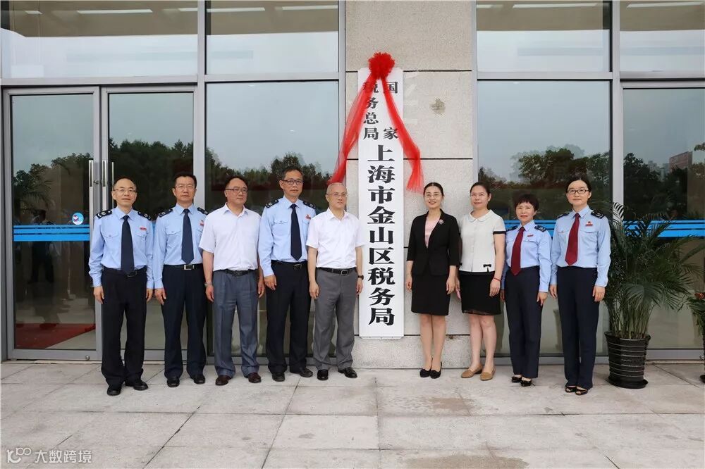 国家税务总局上海市税务局副局长、第四联络督导组组长曹晖和金山区副区长张娣芳共同为“国家税务总局上海市金山区税务局”揭牌,并与税务干部合影。