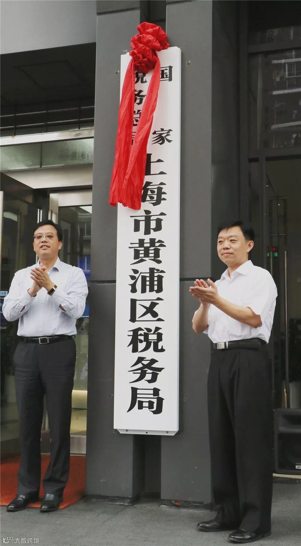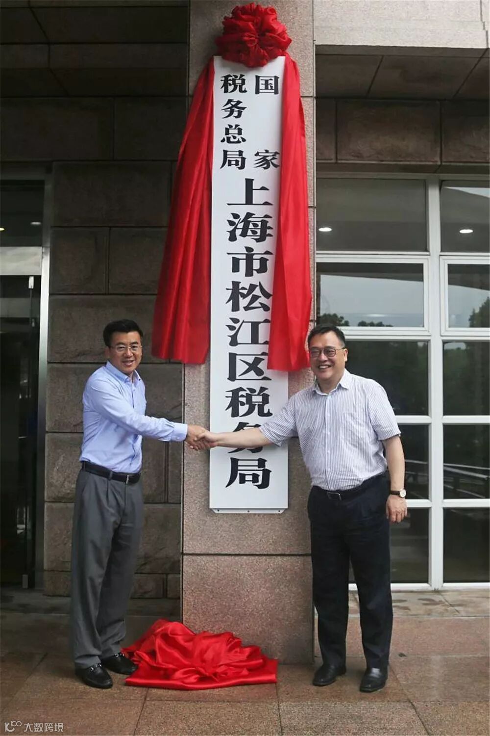 松江区副区长高奕奕和国家税务总局上海市税务局第十六联络督导组常务副组长吴恩共同为“国家税务总局上海市松江区税务局”揭牌。