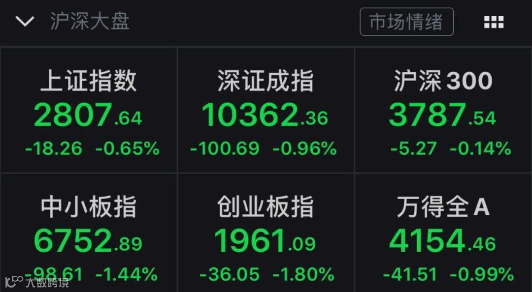 Wind数据显示,截至午间收盘,上证指数下跌0.65%,报2807.64点;深证成指下跌0.96%,报10362.36点;创业板指下跌1.8%,报1961.09点。
