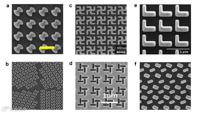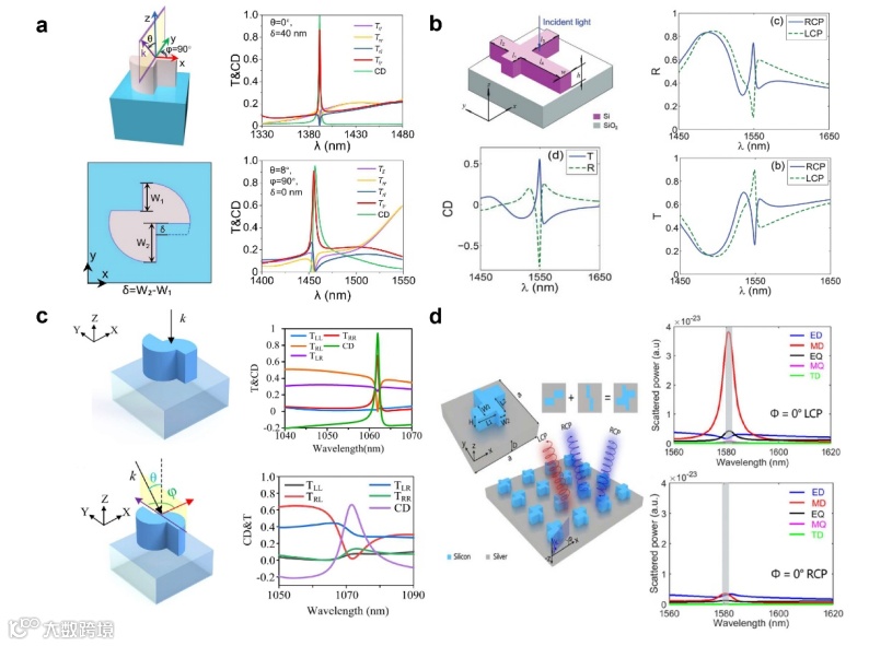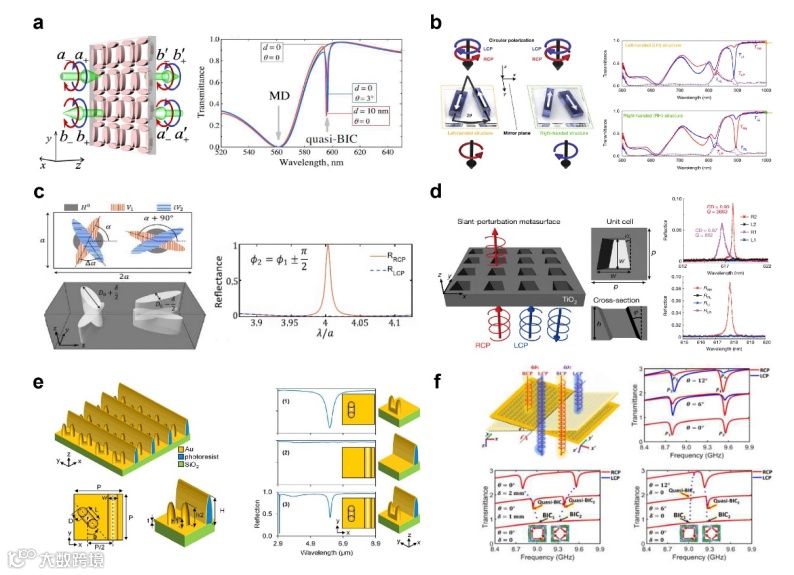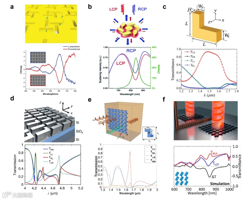图2. 2D手性光学微纳结构: 典型的2D手性结构包括双面镰刀型、卍字型、L形、非对称开口环、S形和多原子结构等,其在结构所在的2D平面内镜像对称性被打破,但在垂直于面内方向上仍具有镜像对称性。其面外对称性导致其光学手性响应表现在偏振转化项上。