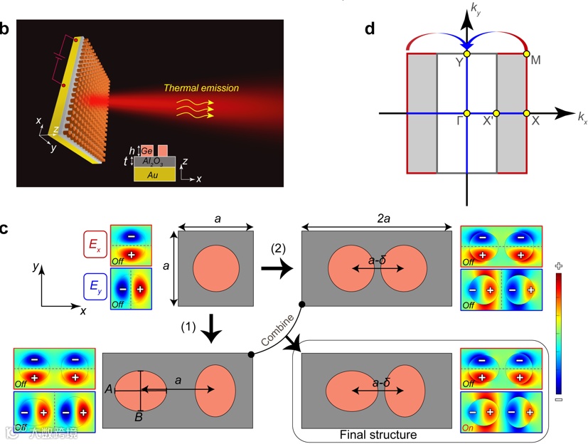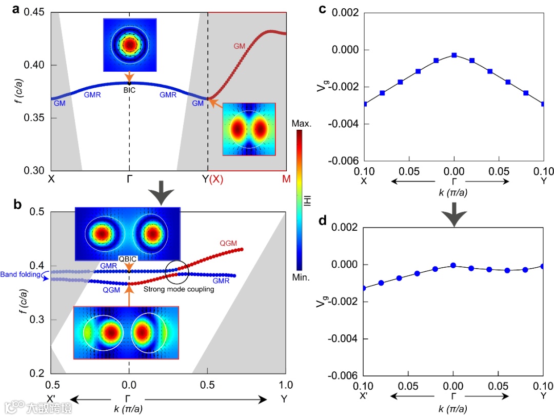 在本工作中,他们提出通过在大范围波矢内利用一种新颖的平带设计,实现了具有超高时间相干性同时消除彩虹效应的热辐射源。这是通过在高折射率介质圆盘的方形晶格中引入几何扰动从而诱导周期加倍来实现的(如图2所示)。由于第一布里渊区减半,导模(Guided modes, GMs)被折叠到Γ点附近,并与原本存在的导模共振(Guided mode resonance,GMR)发生强相互作用,通过灵活调控模式之间的耦合强度,形成了一个整体高Q的平带效应(图3)。