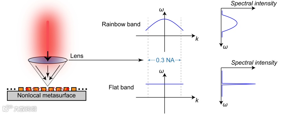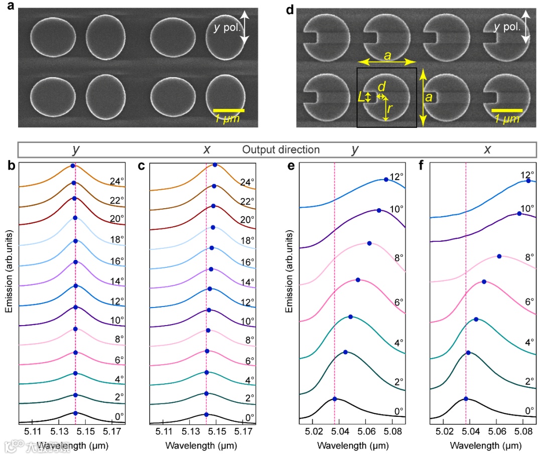 该工作尽管使用了蒸发的非晶材料,但是在实验中仍然展示了5.144 μm输出波长在宽输出角范围内(-17.5°-17.5°)仅23nm线宽的热发射。与传统具有高相干性但存在彩虹效应的热发射结果相比(如图4所示),该器件可以使用光学透镜收集整个结构面积大角度下同频率的热辐射输出,从而显著增强辐射强度并保持超高的Q因子。此外,非局域超表面中的高Q共振需要大量周期之间的集体相互作用,而与平带设计相关的慢光传播对超表面的尺寸要求较低,从而为实现较小占地面积的高功率窄带集成光源迈向重要一步。