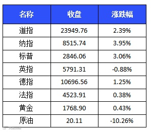 美股周二集体上涨。标普500指数上涨84.43点,涨幅3.06%,报2846.06点;纳斯达克指数上涨323.31点,涨幅3.95%,报8515.74点;道琼斯指数上涨558.99点,涨幅2.39%,报23949.76点。特斯拉再涨逾9%,重回700美元上方;亚马逊创历史新高,涨逾5%。