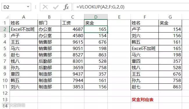 根据姓名将奖金对应表的奖金查找引用过来。