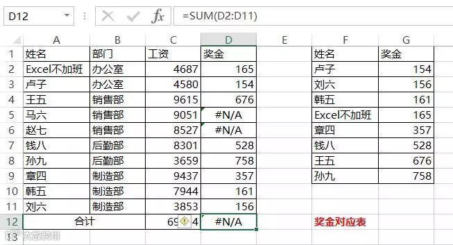 在实际情况下,并不是每个人都有奖金的,这样就导致VLOOKUP函数查找出错,这时用SUM函数求和就出错。