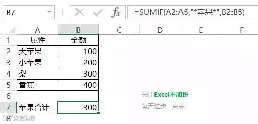 这个函数很好用,支持通配符使用,完全一样的内容可以统计,包含某个字符也可以统计。如统计苹果的金额,这样不管大苹果还是小苹果都统计在里面。