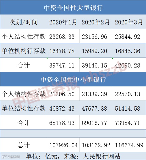 央行近期公布的数据显示,截至3月末,全国大型商业银行结构性存款余额为42690.28亿元,较2月末增加3544.12亿元;中小银行结构性存款余额为73984.71亿元,较2月末增加4967.94亿元。3月末,商业银行结构性存款合计达11.67万亿元,较2019年2月最高点11.2万亿还高出超4000亿元,较上月增加了逾8500亿元。