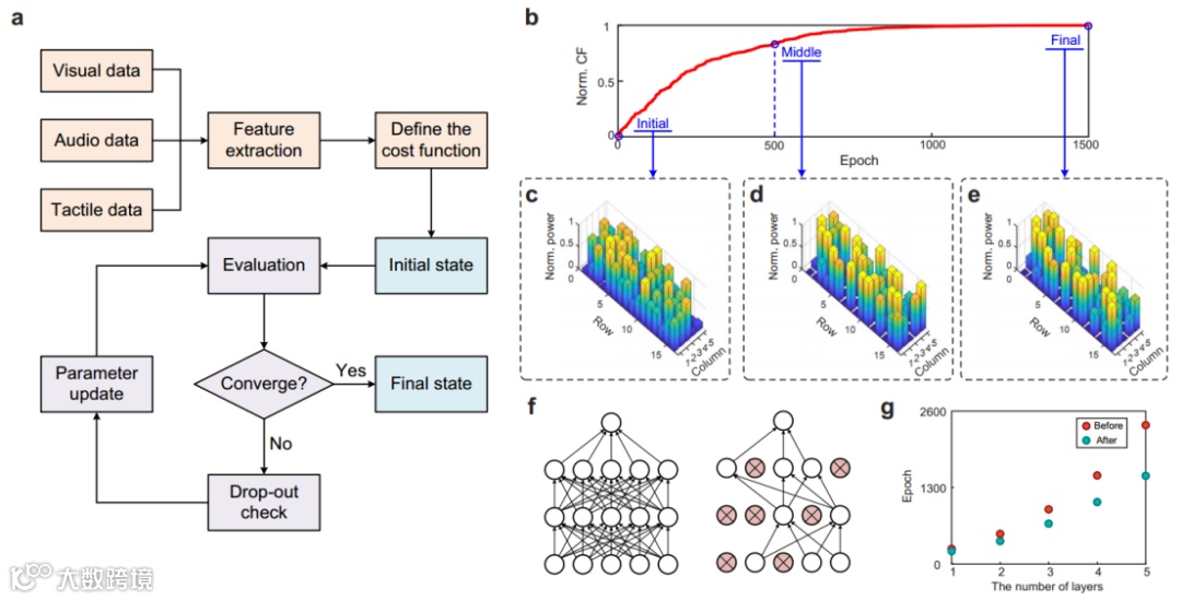 强大的可重构性是计算硬件在多模态深度学习中不可或缺的重要能力。该研究工作提出的TDONN芯片支持光域在线训练,其训练过程可以分为两步:第一步是对不同模态的输入数据进行预处理以提取特征;第二步是对芯片的可调衍射单元参数进行训练和优化以实现目标功能,如图3所示。在第二步中,研究人员还开发了用于光学神经网络的梯度下降算法和dropout机制,用于训练的快速收敛。在完成训练之后,TDONN芯片只需要一次光的前向传播,就可以直接根据输出端口的功率分布得到推理结果。