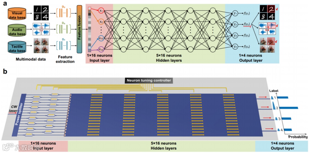 近日,华中科技大学武汉光电国家研究中心张新亮、董建绩教授团队提出了一种用于多模态深度学习的可训练衍射光学神经网络。利用光的相干性和叠加性,大量片上衍射单元可以通过光的衍射在不同模态配置下模拟神经元互联。在光学神经网络训练完成后,只需要一次光的前向传播即可得到推理结果。该工作有望为低功耗人工智能大模型提供潜在的解决方案。相关成果以“Multimodal deep learning using on-chip diffractive optics with in situ training capability”为题,发表在Nature Communications上。